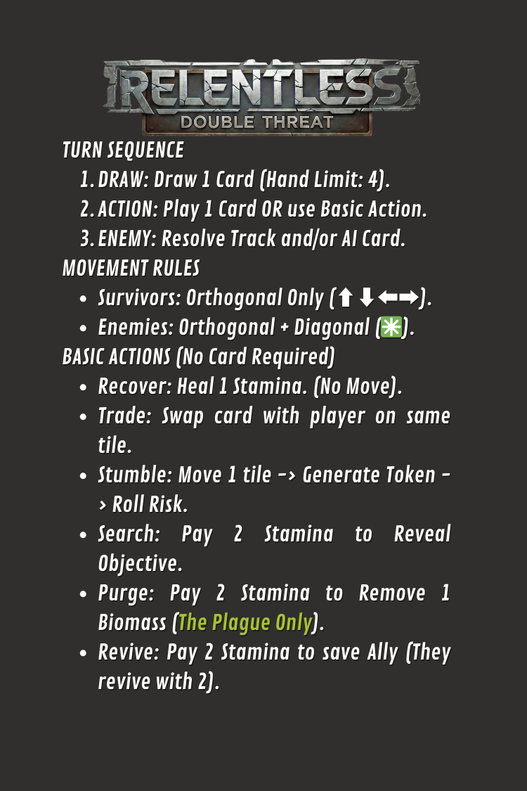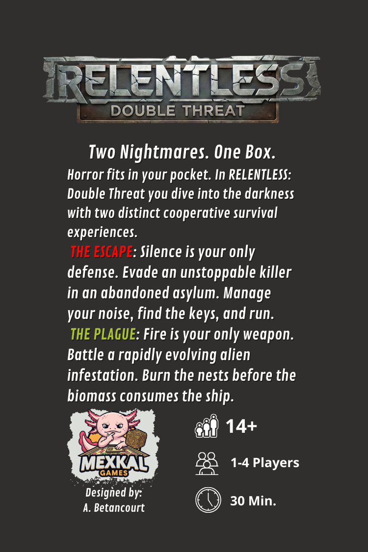Relentless: Double Threat is a tactical survival game that packs a massive punch in a pocket-sized tin. Using a unique dual-sided component system, this box contains two completely different games. With just a flip of the cards, you transport yourself and your team from a blood-soaked asylum to a decaying starship.